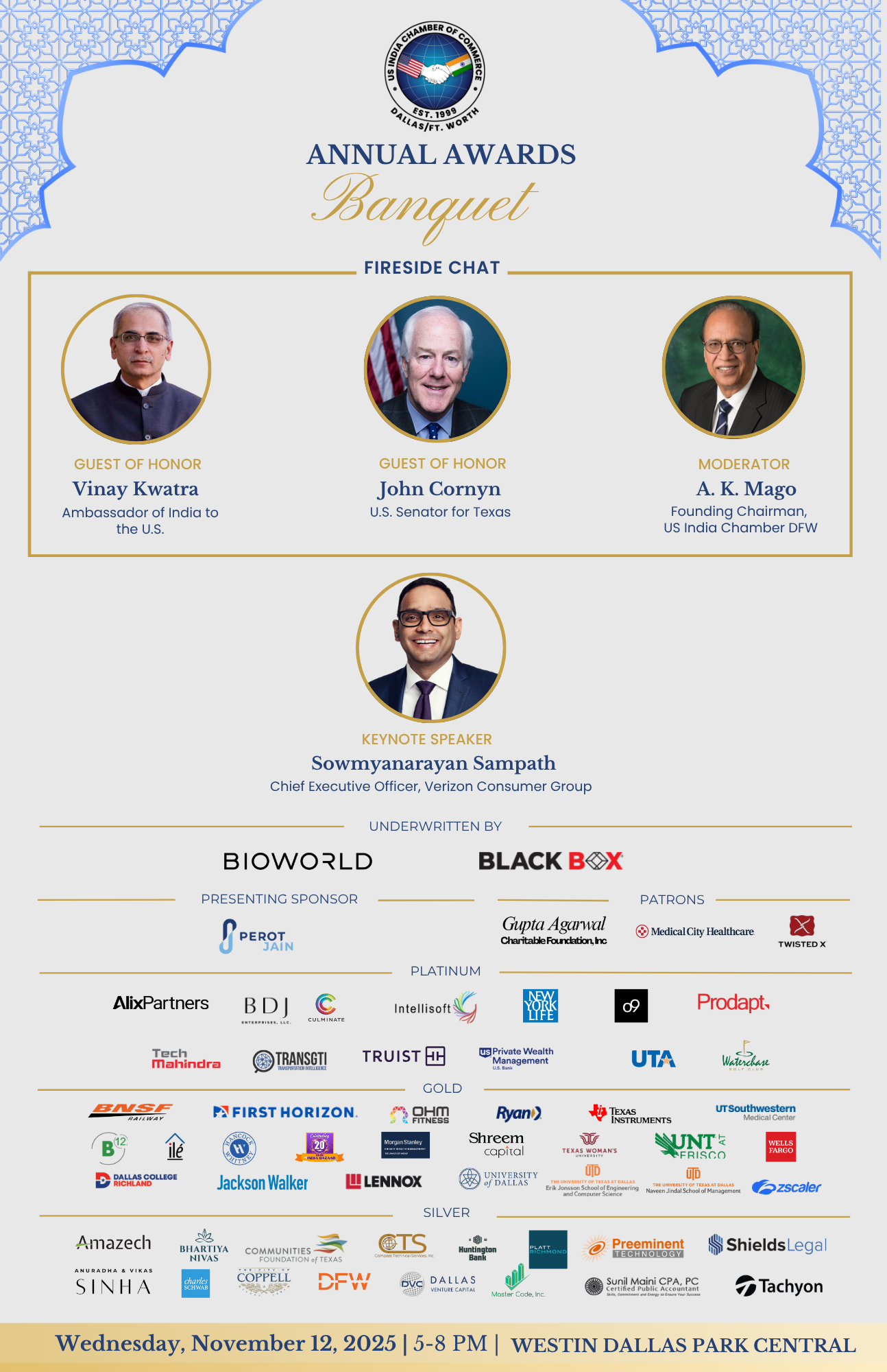 This year we’re honored to have the Ambassador of India to the U.S., Vinay Kwatra and U.S. Senator for Texas, John Cornyn. They will participate in a fireside chat moderated by none other than our founding Chairman, A. K. Mago.